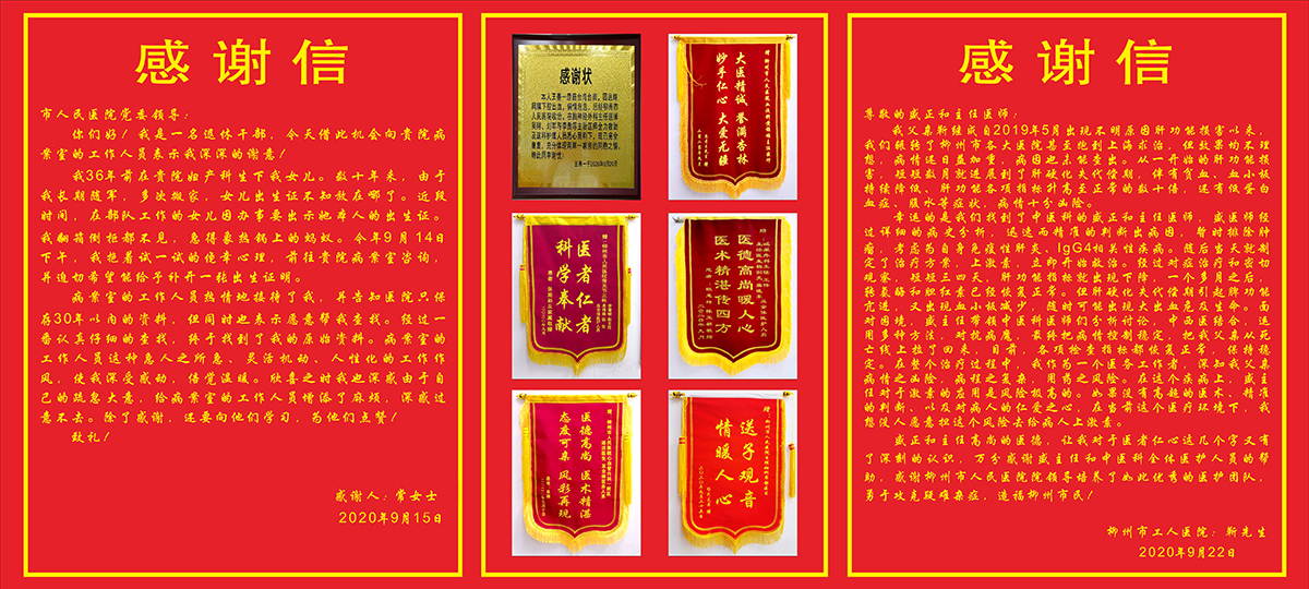 ~~感谢信选登~~ 感 谢 信 一 尊敬的柳州市人民医院领导,你们好: 请允许我借这一纸书信,表达我们一家对贵院全体尽职尽责的医护人员,特别是贵院住院部14楼重症医学科一病区的医护人员深深的谢意。 ...