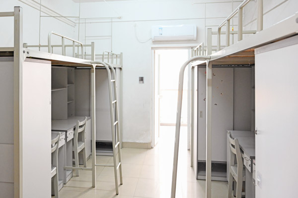 学生公寓位于院区内,宿舍实行公寓化管理,4-8人/间,每间有洗手间、阳台、空调、热水系统,每张床配备书桌、衣柜等,公共区域配备公共洗衣机、微波炉。