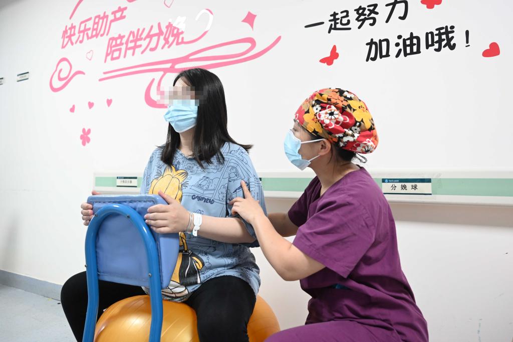 待产期间,为了缓解尧女士焦虑的情绪,确保分娩能够顺利进行,医护人员主动关心尧女士的身体和精神状况,不时用一些轻松幽默的话语缓解紧张氛围。在待产过程中,教会她使用瑜伽球,上下起伏,左右摇摆,对准妈妈的腰骶部、臀部、会阴部起到按摩作用,从而分散注意力,缓解宫缩带来的疼痛。“软软的瑜伽球坐上去,整个人都放松了’’尧女士开心的说到。