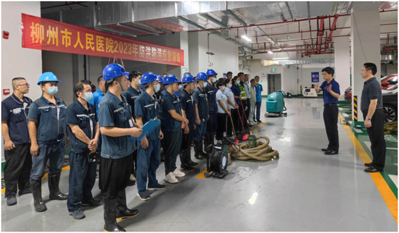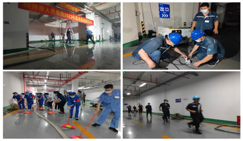 总指挥立即下达抢险指令,启动柳州市人民医院防汛救援应急处置预案——一级响应。接到指令后防汛应急抢险小组(防汛抢险分队、防汛巡查分队、物资供应及保洁分队三个工作小队)和防汛安全保卫工作小组共50余人次火速集结奔赴现场,启用应急抽水泵2台、移动发电机1台,在设立警示标志后,按照各自分工,迅速、高效、有序地进行抢险、巡查。