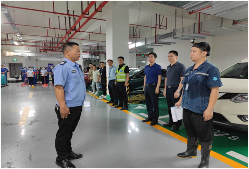 演练现场,拟定当天持续降雨,24小时降雨量达到250mm(大暴雨等级),停车楼负二楼西面抽水泵故障,同时因路面雨水管堵塞导致雨水开始倒灌,停车场发生内涝,区域安保人员巡查发现灾情后逐级上报至分管院领导。