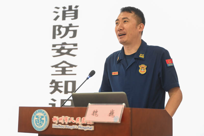 培训环节,柳州市消防救援支队防火监督科科长魏巍结合近年来国内重大火灾案例,重点讲解了防火自救的重要性和严峻性,特别是发生火灾后的自防、自救及逃生技能,并按种类、功能、用途介绍了不同灭火器器材及使用方法,增强了学员的现场体验感。