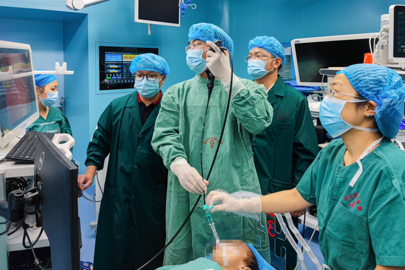 由于患儿年龄小,气道狭小,气道内膜的增生导致局部明显狭窄,如果有炎症或者痰液附着,易导致气道通气功能障碍,甚至危及生命!了解情况后,医院立即组织儿科、呼吸与危重症医学科、麻醉科、重症医学科、耳鼻咽喉科开展多学科会诊。考虑到狭窄部位特殊,如果用传统的开刀、气管切开治疗,对孩子伤害大,且术后并发症多,更适宜进行气管镜下介入治疗解除狭窄。