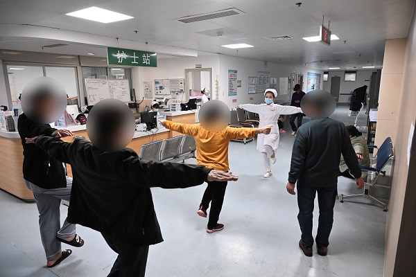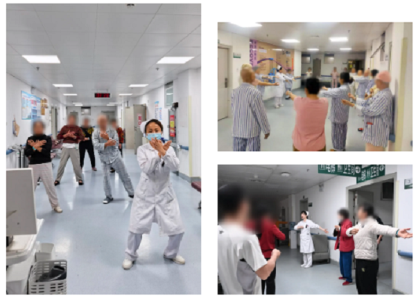 护士站旁,医护人员穿梭队列间,时而纠正动作,时而讲解原理:“‘虎口对压’刺激合谷穴改善脑部供血,‘十指交叉翻掌’激活顶叶运动区,关节的按压能延长关节使用寿命,同时提高手指的灵敏度。”