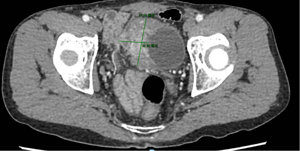 术前影像提示膀胱右侧壁巨大肿瘤,侵犯腹膜及膀胱外脂肪组织