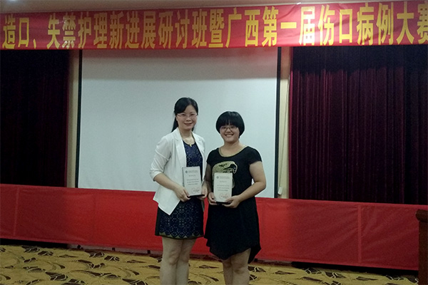 2016年6月19日“广西第一届伤口病例大赛”在广西医科大学附属肿瘤医院如期举行,本次大赛旨在进一步促进区内伤口、造口、失禁护理学术交流,推进专科发展,普及新知识、新技能、新理念,提高伤口、造口、失禁护理的技术和学术水平。比赛共分为初赛和决赛两个阶段,经过层层选拔,紧张角逐,我院选派的覃琛媛、曹婧两名选手在大赛中表现优异,从全区20家医院、43位参赛选手中脱颖而出,以个人总分第一名、第二名的好成绩同时荣获一等奖殊荣。