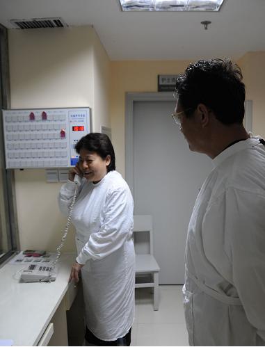 自治区副主席李康(左)通过电话和柳州市第一例甲型H1N1确诊患者通话,并祝她早日恢复健康。