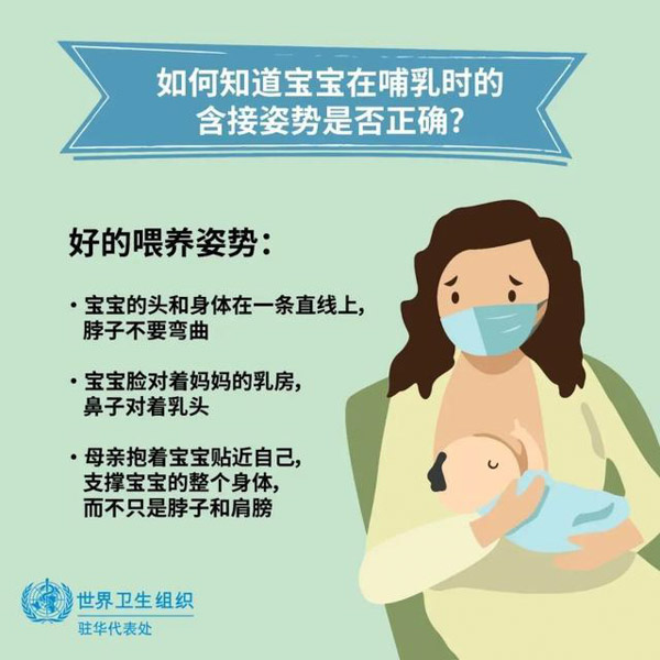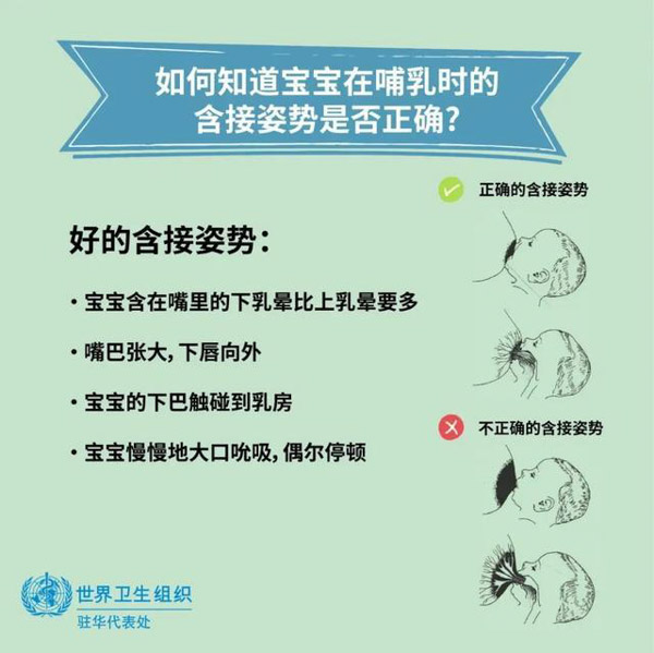 2.正确的哺乳姿势和乳房含接是成功母乳喂养的关键环节。哺乳时婴儿头和身体呈一条直线,身体贴近母亲,应将母亲乳房的大部分乳晕含在口中。
