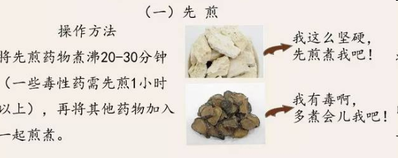 (一)先煎:将“先煎药”煮沸20-30分钟,再加入其它药同煎。主要适用于贝壳类、矿石类、角甲类或毒性中药。