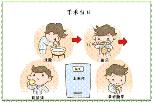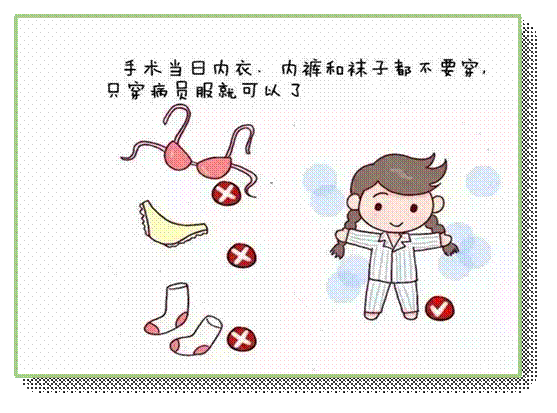 3.手术当日清晨您可以洗脸刷牙,但不能饮水,排空大小便。更换好病号服,不能穿内衣、内裤,取下假牙、饰品、发卡、手表、眼镜,不带手机及贵重物品进入手术室。