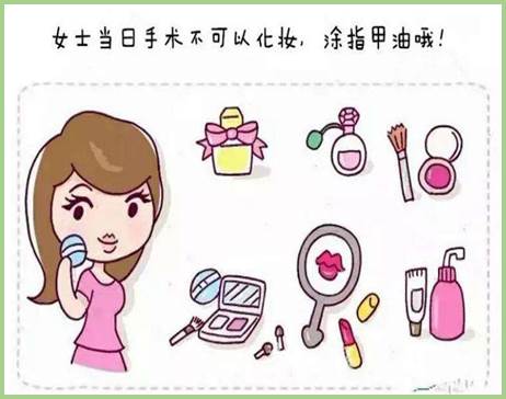 4.在手术当日尽量素颜,避免涂抹指甲油。化妆会影响医生对手术患者面色的判断,指甲油胶会影响血氧仪的数据监测。