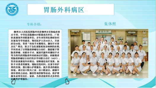 柳州市人民医院胃肠外科是柳州市最早从普通外科独立出来的亚专科,是柳州市首批临床重点专科、中华结直肠癌MDT联盟广西分盟副主席单位、广西临床重点专科、广西医疗卫生重点学科、国家级住院医师规范化培训基地。多年来坚持医教研协同发展指导学科建设,现有医护人员30多人,主任医师3人,副主任医师4人,博士1人,硕士6人,硕士研究生导师3人,开放床位60张,多数医师到过国内外著名医学中心进修学习,其中德国访问学者2人。