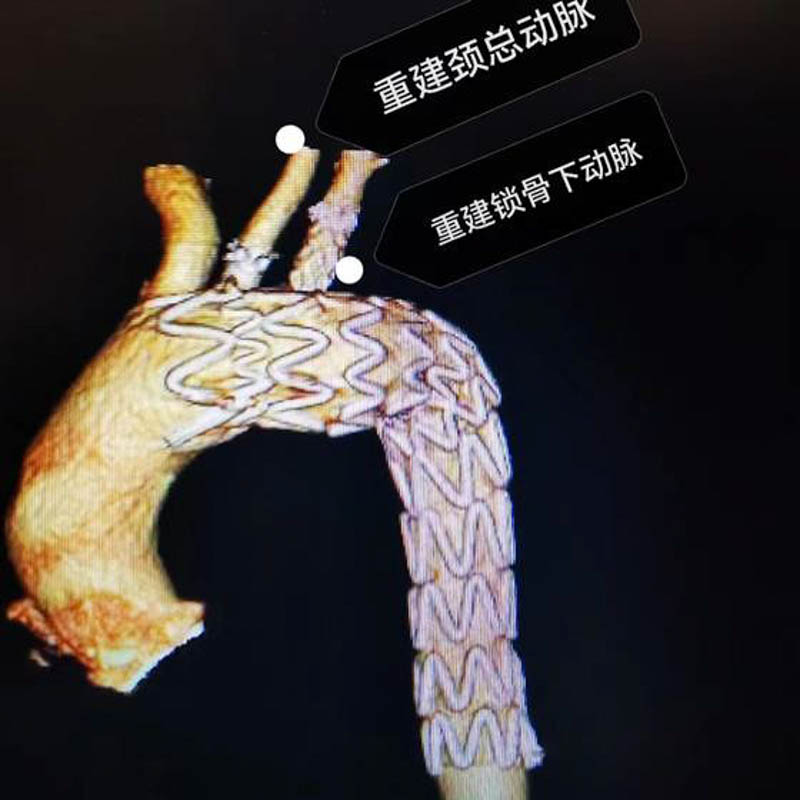 由于覃老伯年纪较大,胸主动脉直径达40mm、且主动脉溃疡位置特殊,实施常规治疗会面临两难的选择:如果确切覆盖溃疡破口势必会把破口旁边的重要分支血管一起覆盖,导致分支血管血流中断,会产生部位相应的缺血表现;如果不覆盖分支血管,很可能溃疡破口也覆盖不全而出现内漏,从而无法达到理想的治疗效果。