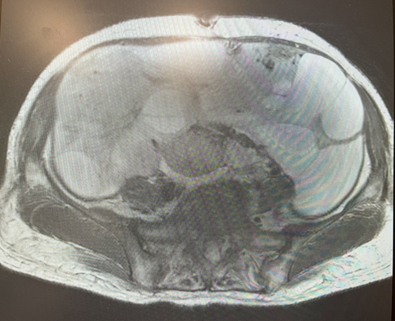 妇科二病区主任陈煜岊认真询问病史,并为患者进行专科检查。B超提示于盆腹腔见一186mm×117mm巨大囊实性肿物,上至剑突下,右至腋前线,左至腋中线。