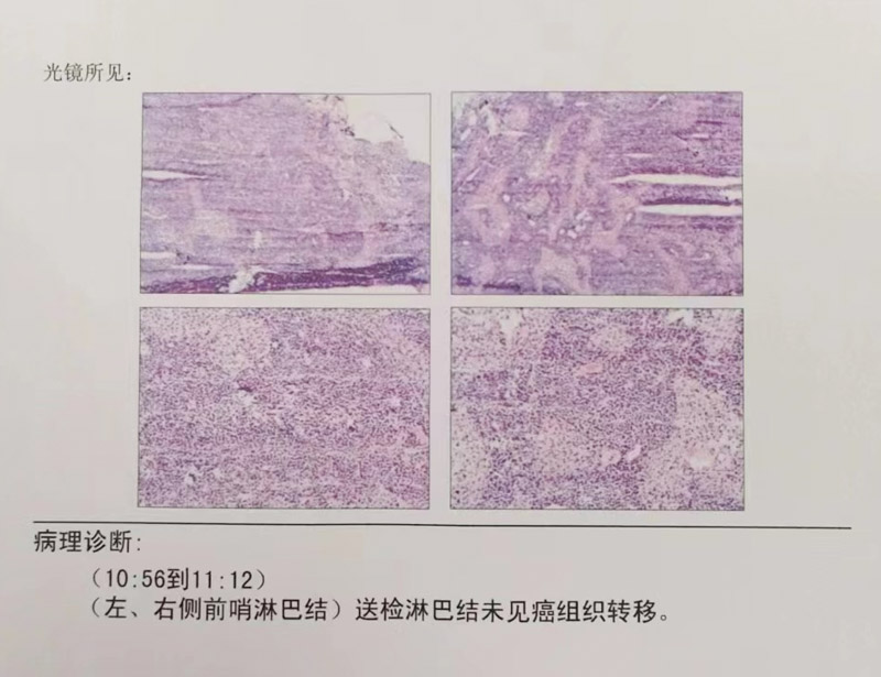 经过充分准备,手术如期进行,吲哚菁绿宫颈注射后盆腔内前哨淋巴结显影良好,柳州市人民医院妇科手术团队在荧光腹腔镜指示下顺利切除左、右盆腔前哨淋巴结送快速冰冻病理检查。经半小时等待,好消息传来,快速病理回报左、右侧盆腔前哨淋巴结均无转移!这意味着韦阿姨不需要进行盆腹腔淋巴结系统切除。随后,陈煜岊主任耐心细致按计划切除了患者子宫附件,手术圆满成功。
