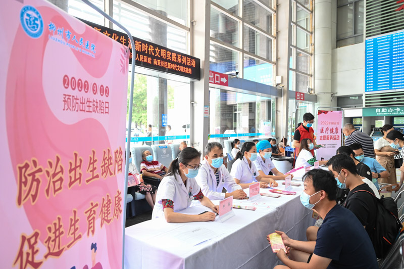 产科、儿科、生殖医学科、预防保健科等科室组成的专家团队在门诊一楼大厅开展义诊活动,旨在深化宣传防治出生缺陷、提高优生优育服务水平。