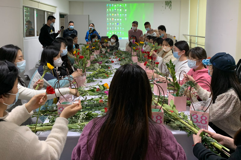 3月8日上午,20位准妈妈带着腹中宝宝相约孕妇学校与鲜花邂逅。伴随着舒缓的音乐,准妈妈们完全沉浸在插花的过程中,花草的芬芳唤醒她们的五感、六观,缓解她们的心理压力,加上准爸爸的配合,精心修剪、整枝、构思、搭配,一个个造型优美、色彩绚烂的作品展现在大家面前。