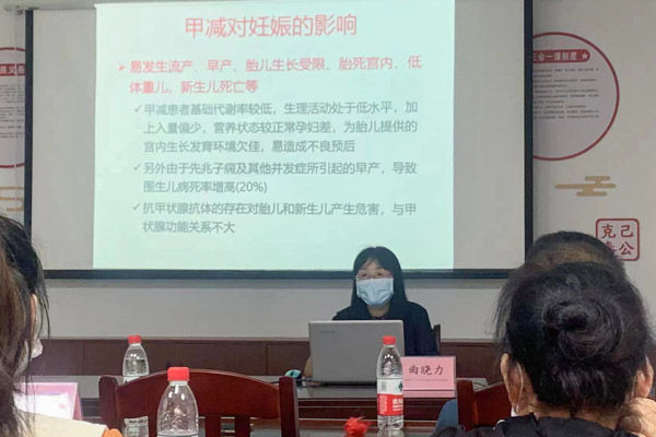 课上,曲晓力博士介绍甲状腺是人体最大的内分泌腺,位于喉结下方约2-3cm处,其分泌的甲状腺激素是人体重要的激素之一,促进人体大脑、脊髓等组织的生长发育,还可以促进体内糖分、脂质等物质的代谢,调节体内激素平衡。女性是甲状腺疾病的高发人群,尤其是育龄期妇女。甲状腺功能异常可显著增加不良妊娠结局的风险,尤其未治疗的妊娠期甲减,易发生流产、早产、胎儿生长受限、胎死宫内、低体重儿、新生儿死亡等。