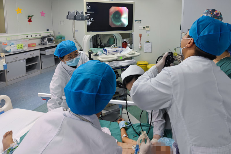 医院立即组织了儿科、耳鼻咽喉科、呼吸与危重症医学科、麻醉科开展了多学科会诊,一致认为取出异物刻不容缓,详细讨论麻醉及手术方式,最终决定先将异物送入右主支气管,保证患儿通气,再由儿童呼吸介入团队进行麻醉后纤支镜下支气管异物取出术,必要时行球囊气管扩张后取出异物。