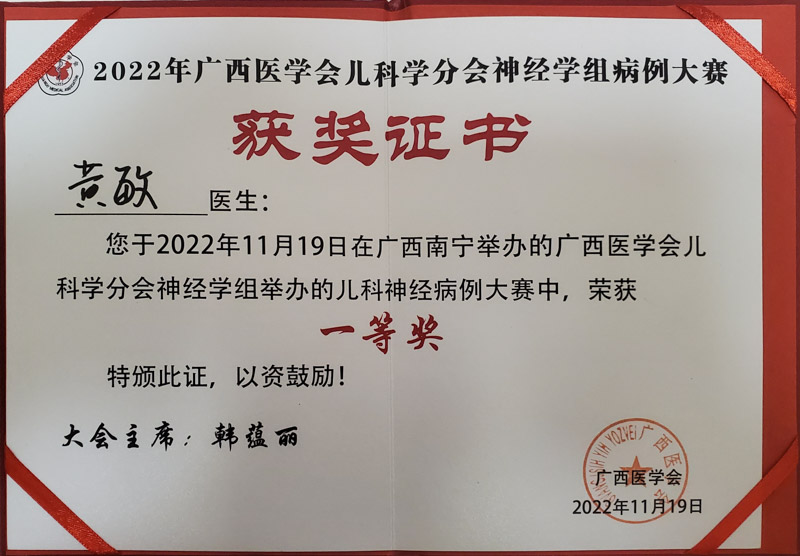 近日,2022年广西医学会儿科学分会神经学组学术年会暨儿科神经病例大赛在南宁顺利举行。柳州市人民医院儿科副主任医师黄敏以精彩的演讲和出色的表现得到评委专家们的一致好评,夺得比赛一等奖!