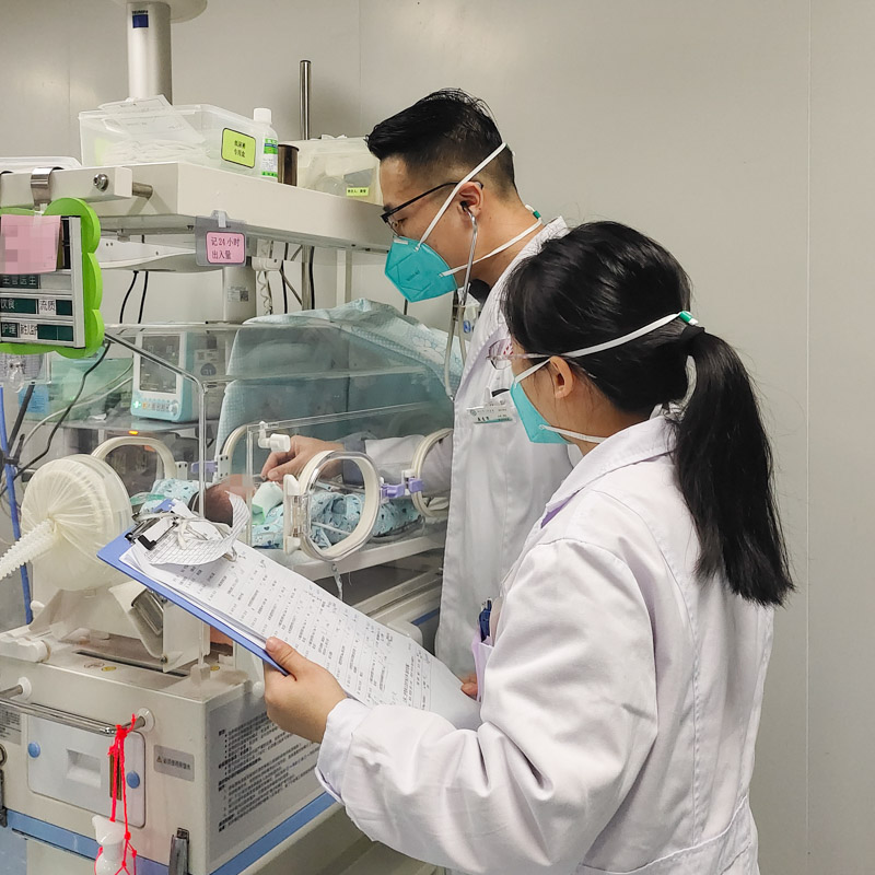 原来,韦先生的小女儿琳琳(化名)是一名孕29周剖宫产出生的早产儿,出生时琳琳只有巴掌大小,且出生前胎膜就早破了7天,这意味着琳琳极有可能发生了宫内感染,情况十分危险。时间就是生命,患儿立即被转入了新生儿科住院治疗,入院时发现琳琳呼吸急促,监测氧饱仅能维持在88%左右,这提示琳琳有新生儿呼吸窘迫综合征表现,如不及时治疗,可有呼吸衰竭等的风险。时间紧迫,新生儿科医护人员立即予鼻塞CPAP辅助通气治疗改善氧合、开通脐静脉通路予静脉营养、鼻饲喂养,综合评估病情予抗感染等治疗。