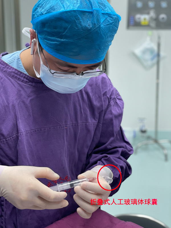 随着时间的推移,王先生的眼睛也在慢慢恢复,期间也做了两次硅油置换手术。2022年2月,王先生再次来到柳州市人民医院,付鹏医生为其做了视网膜增殖膜的清理,充分松解牵拉,经评估,植入折叠式人工玻璃体球囊的时机已经成熟。