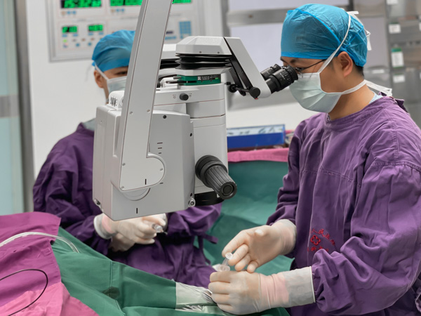 2022年2月24日,眼科团队为患者王先生进行了人工玻璃体球囊植入术,经过一个多小时,顺利将人工玻璃体球囊植入了患者眼内。