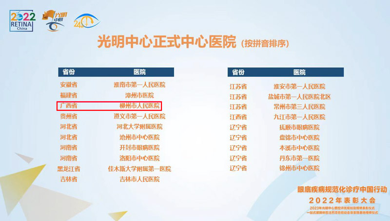 11月23日下午,在长沙举办的眼底疾病规范化诊疗中国行动2022年表彰大会传来好消息,柳州市人民医院荣获2022光明中心优秀中心并获得眼底疾病规范化诊疗优秀案例表彰,是广西区域内唯一一家获得该项荣誉的医院,标志着柳州市人民医院眼底疾病诊疗水平获得了国内眼科学界的认可。