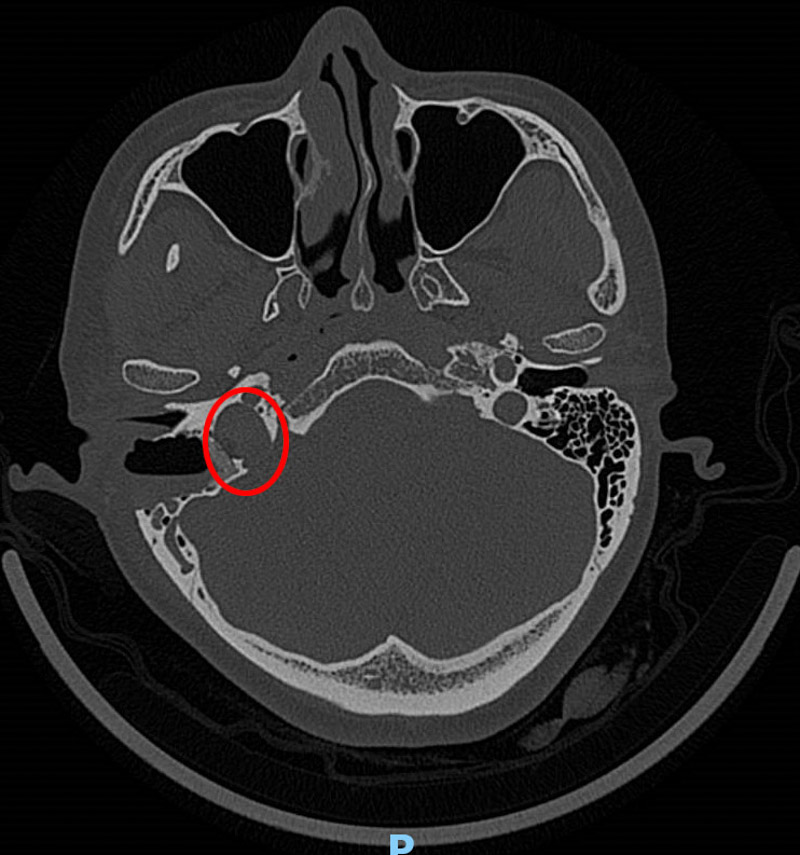 接诊医生了解情况后,为韦女士做了耳内镜及听力学检查,并没发现异常,但根据患者的实际情况并结合多年的经验判断,患者的右耳有可能患有血管搏动性耳鸣。为了进一步证实,患者进行了高分辨头颅CT检查,果不其然,放射科医生在CT影像学中发现了蛛丝马迹:患者的右侧颈静脉球高位,可疑合并前壁和外侧壁缺损。这就是导致韦女士耳鸣的罪魁祸首!