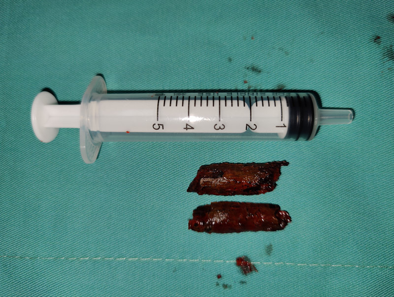 术中,口腔颌面外科团队自面部将原伤口切开,见大量脓液喷涌而出,伤口深,视野差,大大增加了异物取出的难度,如果异物清除不干净,会导致创口内持续发炎,导致二次手术。