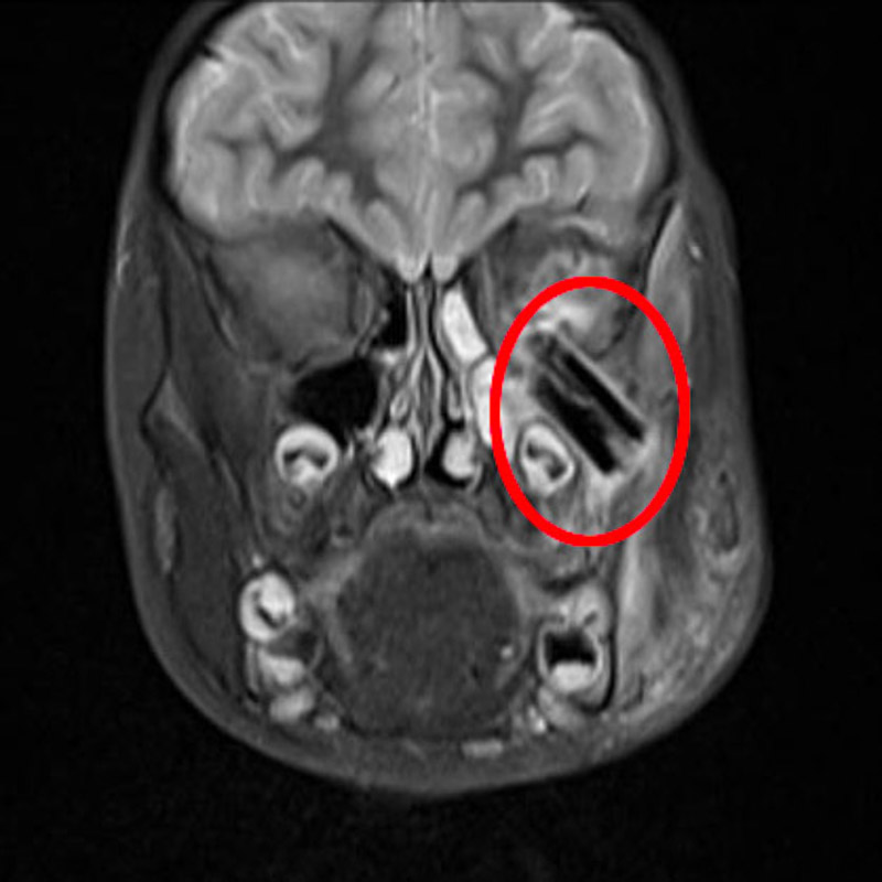 接诊医生得知患儿曾摔跤受伤,便推断伤口可能有异物残留,立即安排其入院进行详细检查。检查发现树枝从面部直插颞下窝至眼球后方,还有零星碎片断在颅底,导致眼球位移,面颊部、鼻部、眼部感染,情况不容乐观。